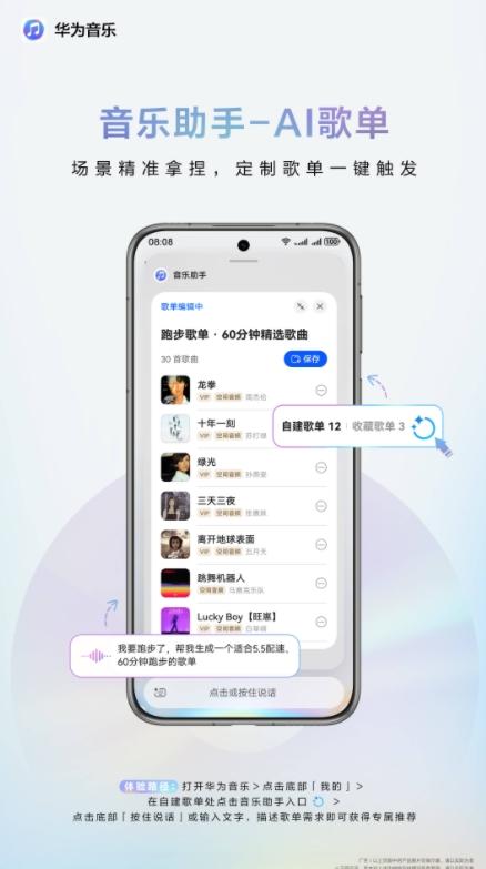 你是否厌倦了千篇一律的推荐歌单?是否在为找不到适合特定场景的音乐而烦恼?华为音乐的“AI歌单”功能,基于小艺智能体平台先进的自然语言处理模型,能够结合你的听歌历史、偏好、情景、心情等多维度数据,精准定制个性化歌单。无论是户外跑步、派对狂欢,还是深夜加班、周末大扫除,只需在华为音乐-我的中找到“智能圆圈图标”,点击唤醒音乐助手,长按底部栏说“我要跑步了,帮我生成一个适合5.5配速、60分钟跑步的歌单”,很快一张专属歌单便新鲜出炉,支持一键保存,彻底告别繁琐的查找操作。它还会根据你的反馈动态调整,越用越懂你!从此找歌不再费神,每个人都能轻松拥有“音乐私人定制”。